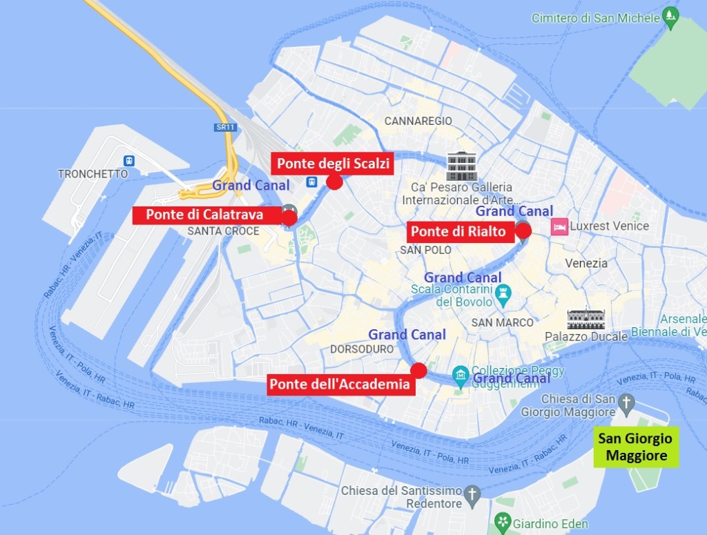 Ou encore, découvrir les 4 ponts qui traversent le Grand Canal de Venise :