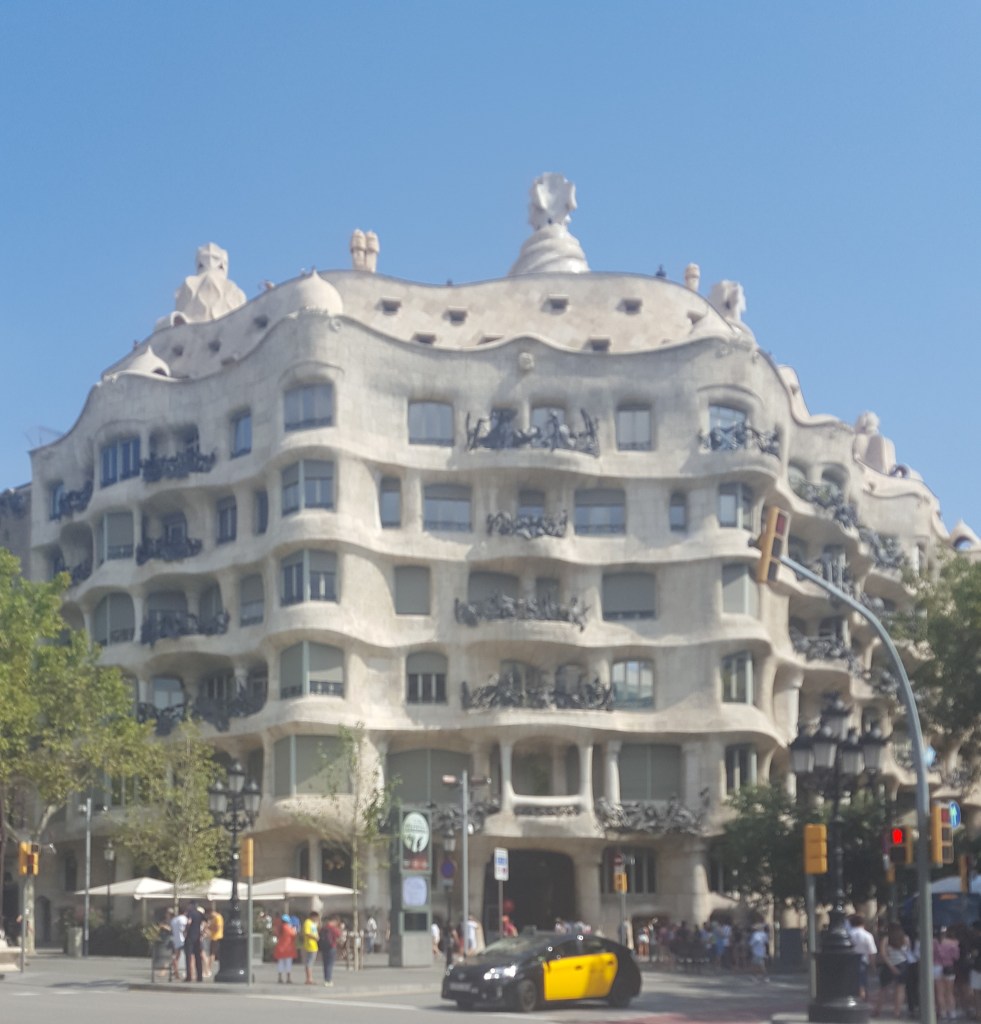 Casa Milà is a building designed by Gaudi. Like many of his known works, it has an unconventional form. The facade is made of curved shapes.