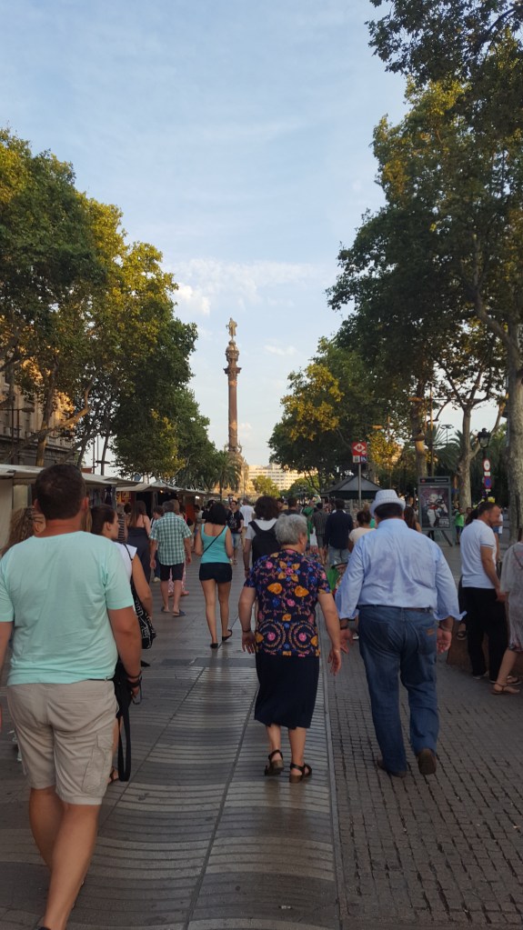 La Rambla is THE big avenue in Barcelona, which connects the Plaça Catalunya to old port. The street is 1.2 kilometers long. It ends at the sea, in front of the Christopher Columbus column (After the discovery of the Americas, Columbus returned to Barcelona in 1493 to report his journey. Today, he sits at the top of this 60-meter column , pointing at America