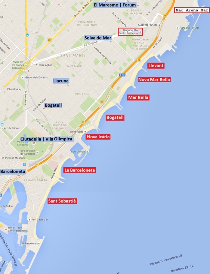 La Barceloneta is certainly the most known and busiest beach. It is also the closest beach to the city center. La Barceloneta is located in front of the mirador de Christophe Colomb.