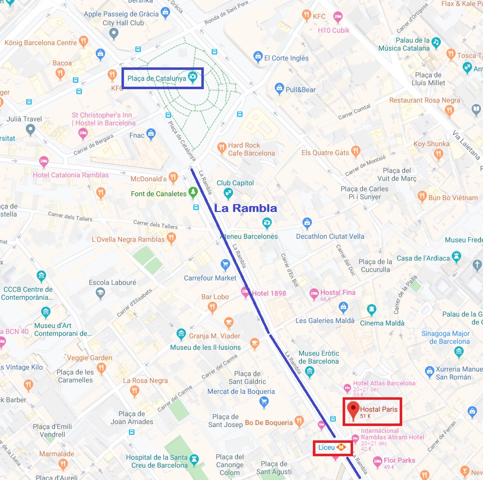 We chose to stay in the famous Rambla. Our accommodation is located almost halfway between the « Catalonia Square » and the « Mirador de Colom », just in front of the subway station: « Liceu«