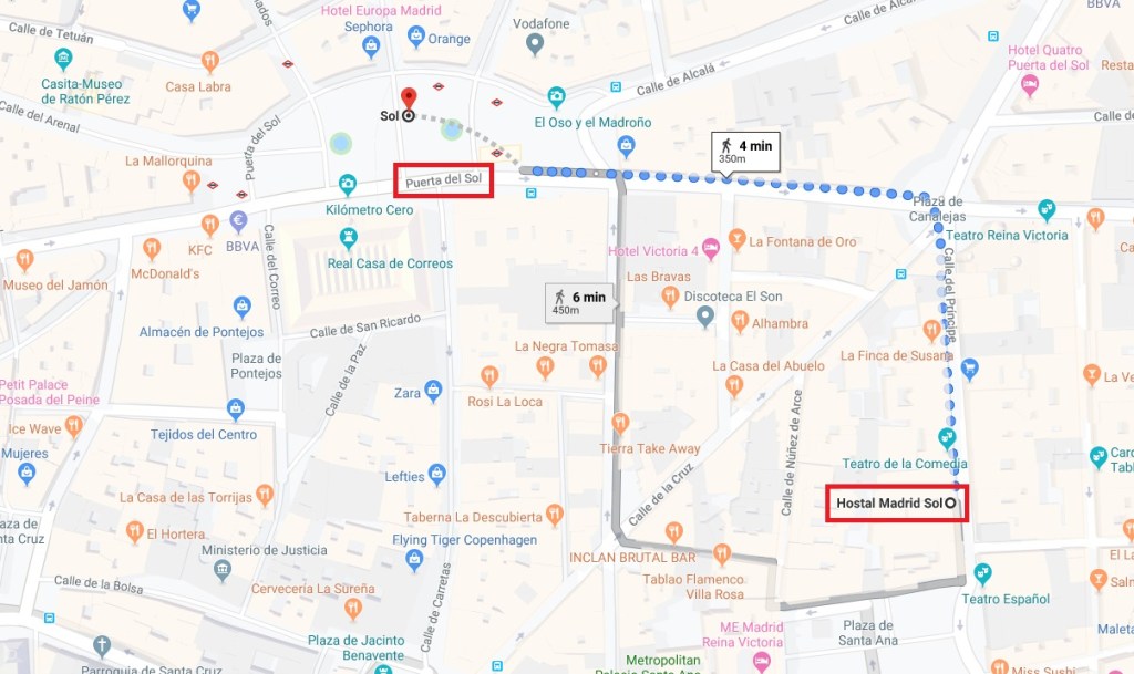Our accommodation is located 4 minutes from the main square of Madrid: « Puerta del Sol »