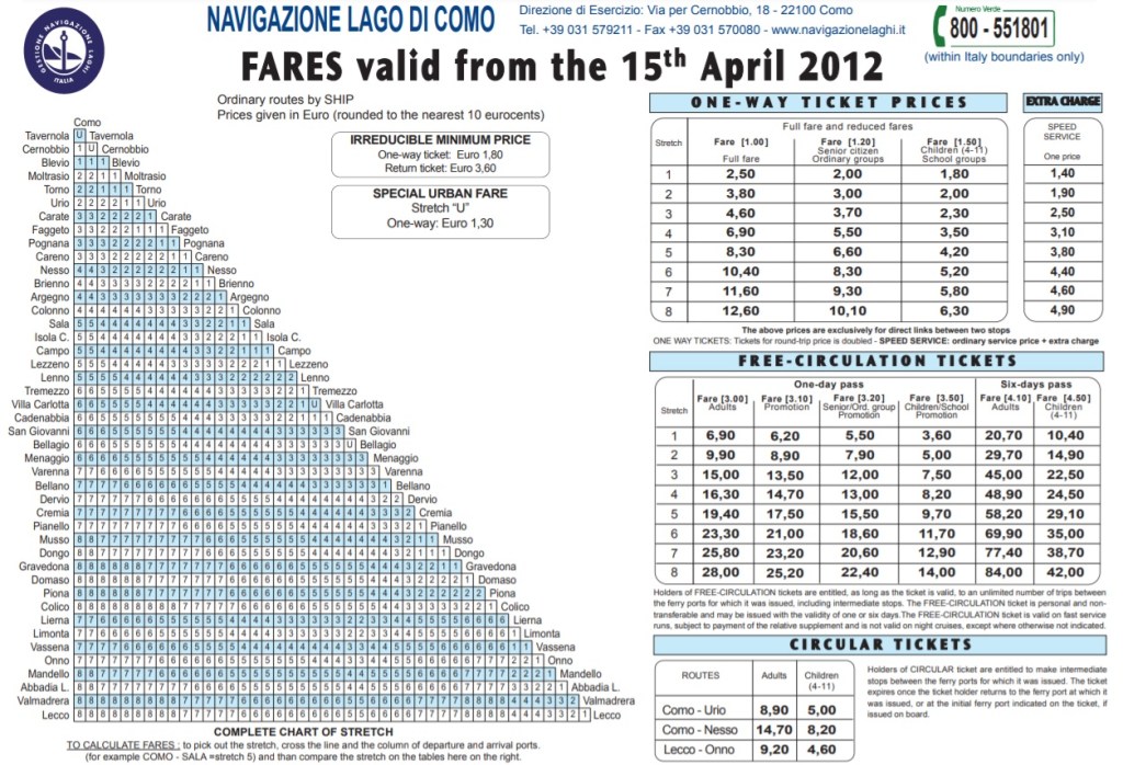 We take a return ticket to Varenna without the car (9.2 € per person). Below are the prices and timetables of the ferries that connect the different villages of Como Lake
