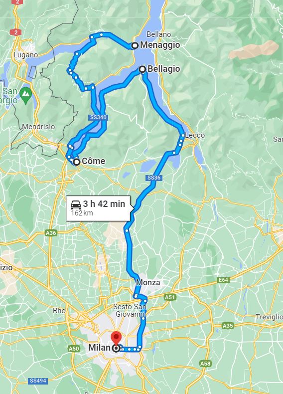 We take the road to Milano along the coast of Lake Como passing through the beautiful village of « Bellagio »