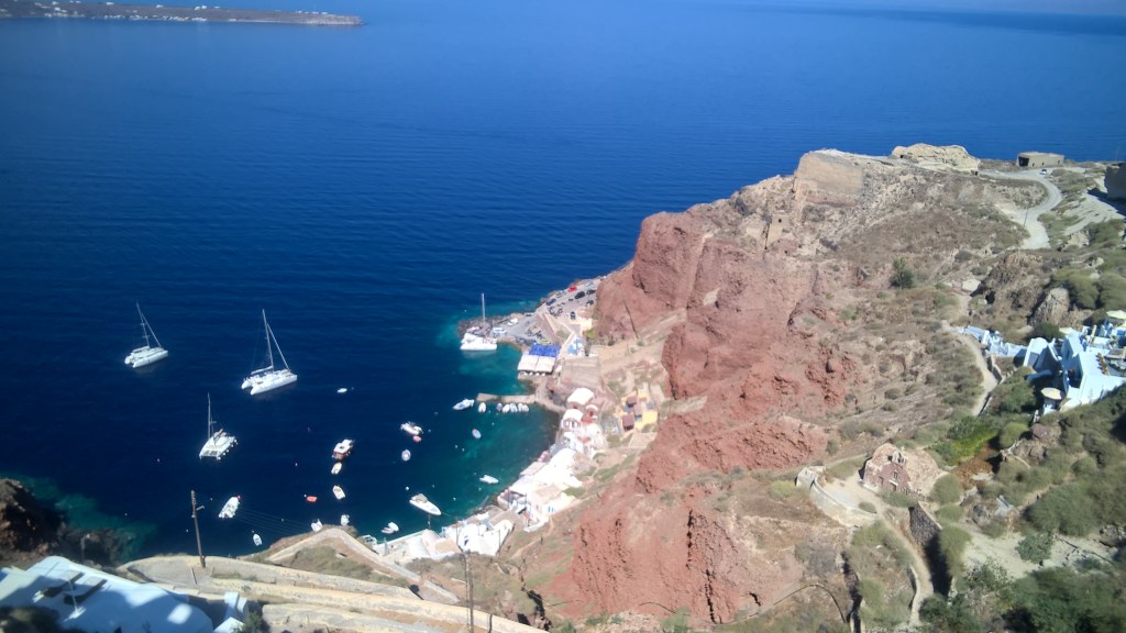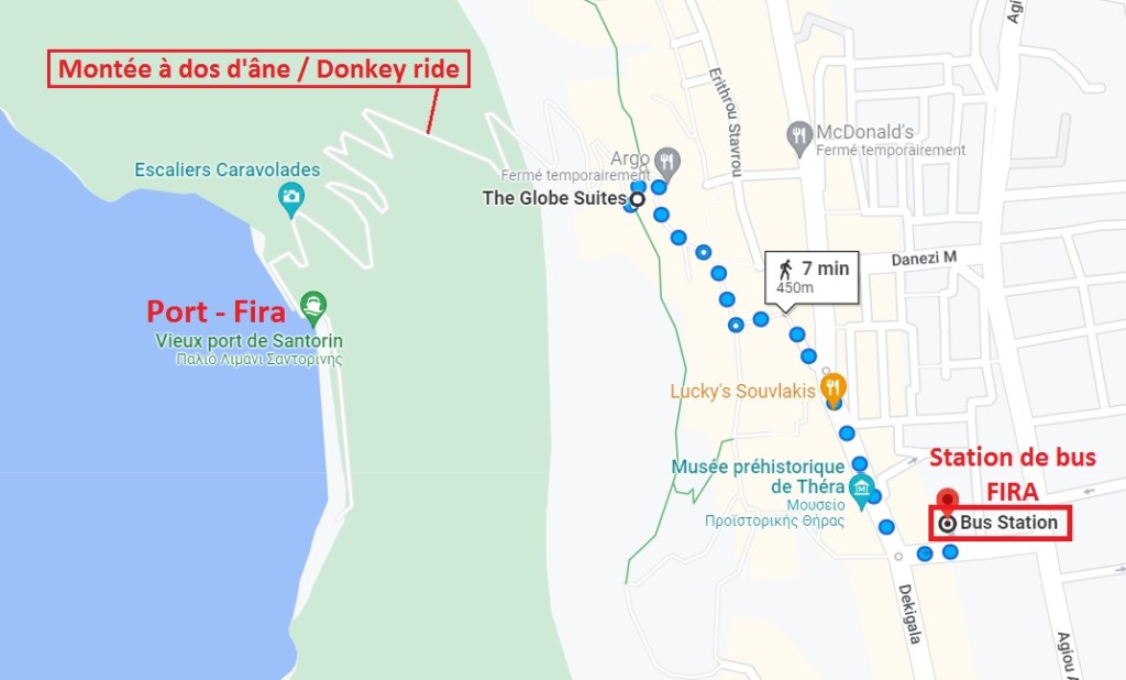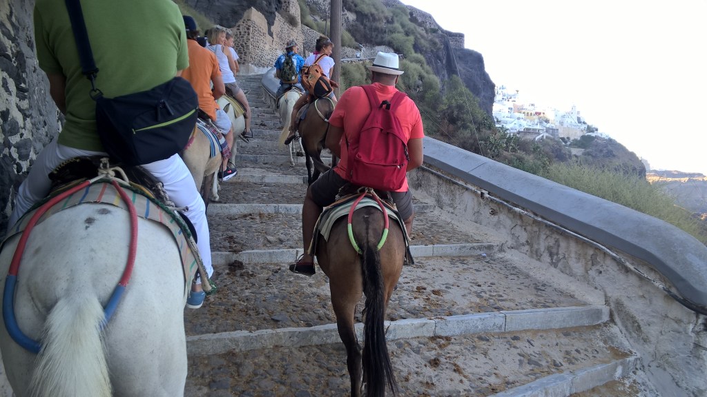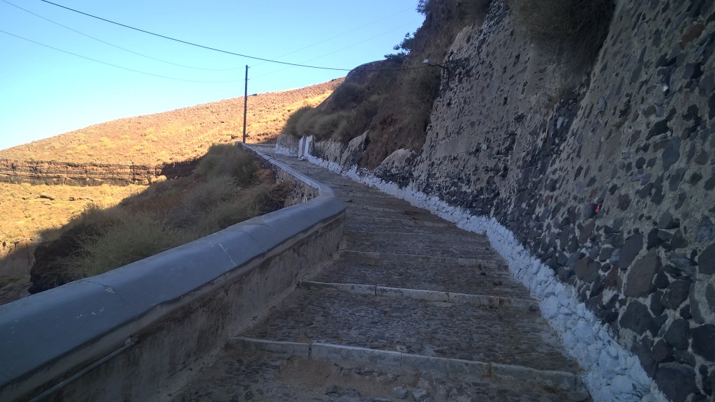 Pour le retour à Fira, nous reprenons le bus. Pour descendre vers le port, vous pouvez toujours prendre le téléphérique, louer un âne, ou faire comme nous, descendre les marches à pieds. Si vous descendez à pied, sachez que c’est le même chemin emprunté par les ânes, et que c’est un peu glissant : Attention !