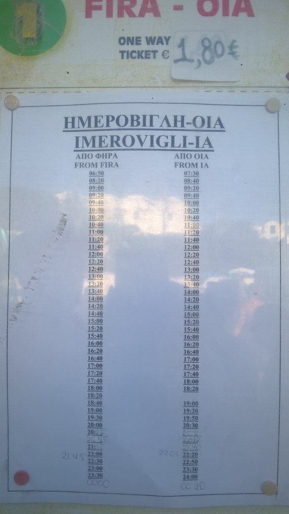 Nous arrivons tout en haut de Fira et nous dirigeons vers la station des bus. C’est ici que se trouvent les bus que partent vers Oia