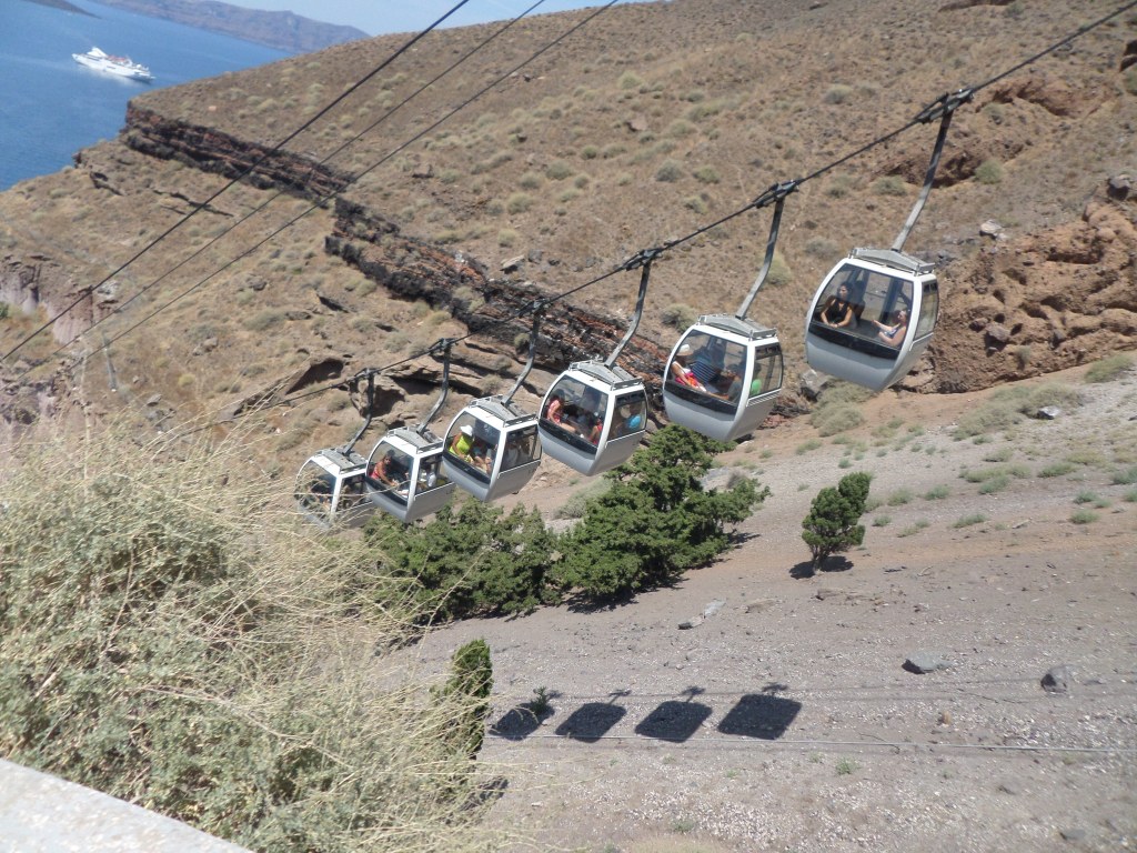 Comme Mykonos, le port de Fira à Santorin est trop petit pour accueillir les bateaux de croisières. Notre bateau reste dans le large et nous sommes débarqués via des chaloupes. La compagnie distribue des petites cartes avec des numéros. Le numéro correspond à la chaloupe à laquelle vous êtes affecté.