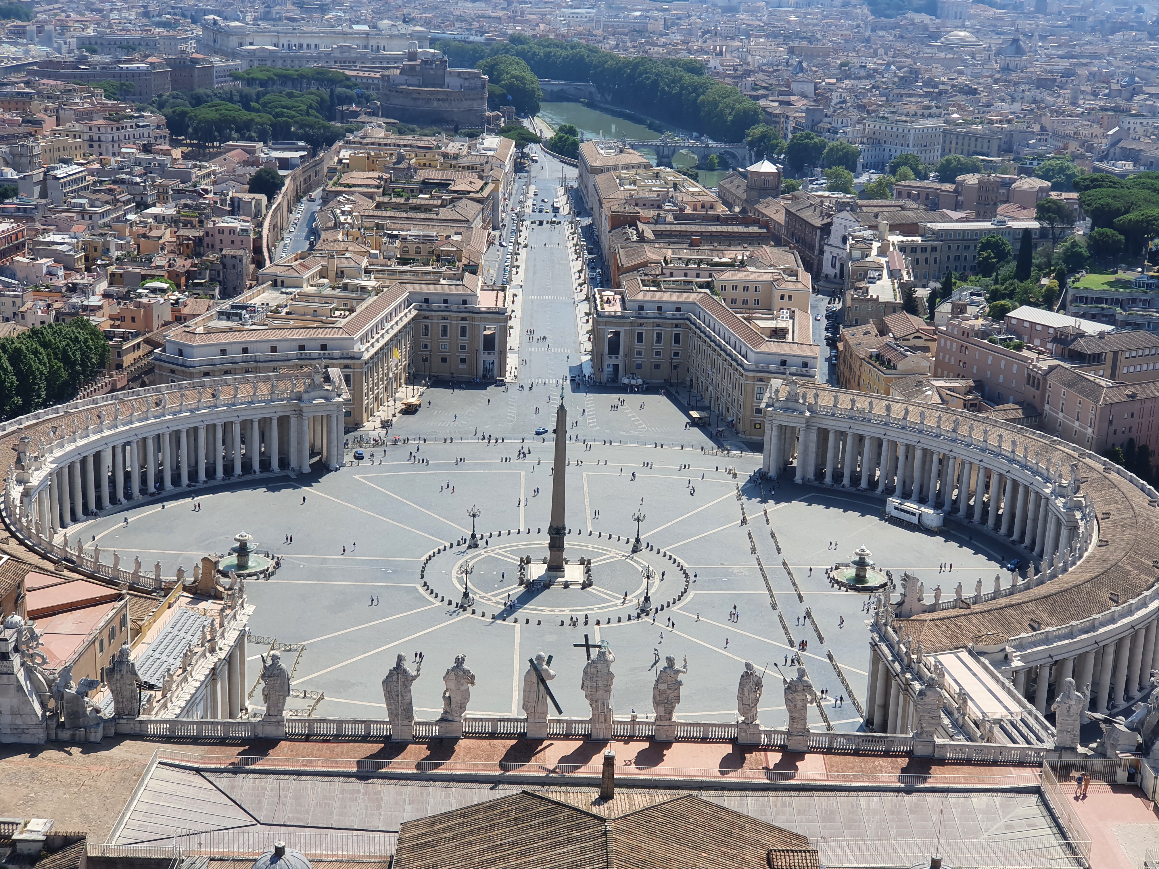 After climbing up narrow and cramped stairs, you will arrive on the roof of the basilica. This is the best place to admire St. Peter’s Square (Piazza San Pietro):