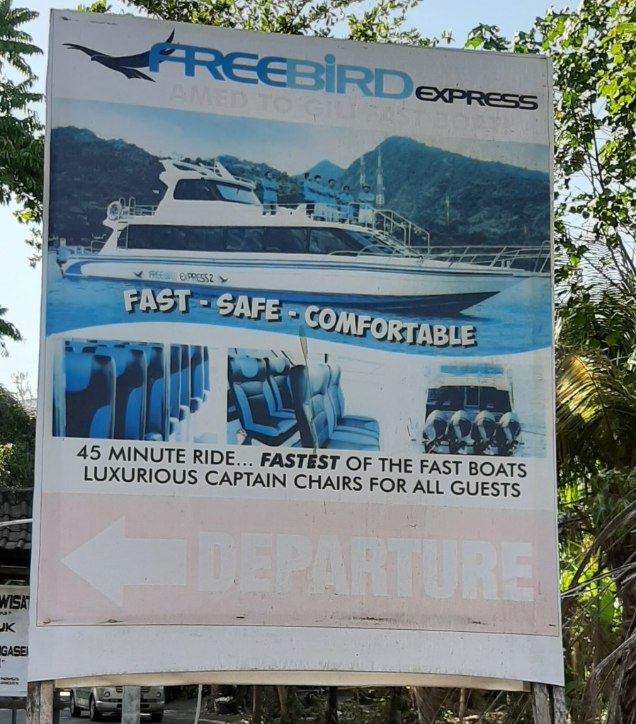 We go to the meeting point for the Fast Boat to Gili: Freebird Express