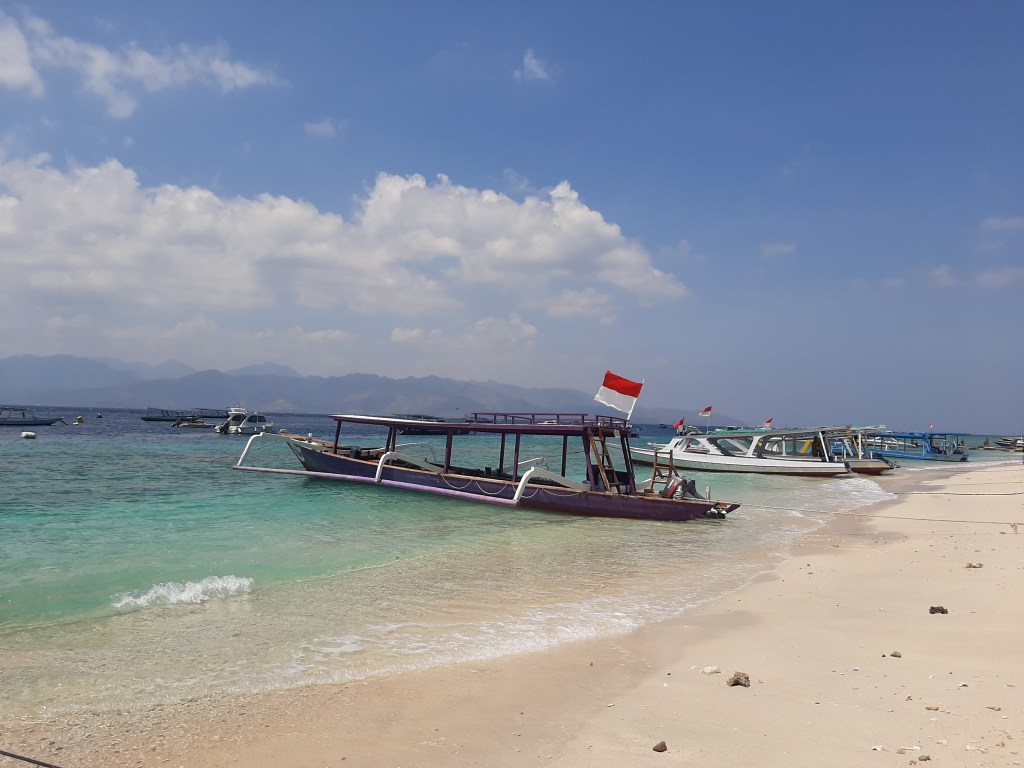 At 10:15 am, the boat leaves Amed towards Gili. It lasts 1 hour. Watch out for seasickness. The boat shakes very hard. We arrive around 11:15 am on a beach with very clear water. We collect our bags and go to the hotel.