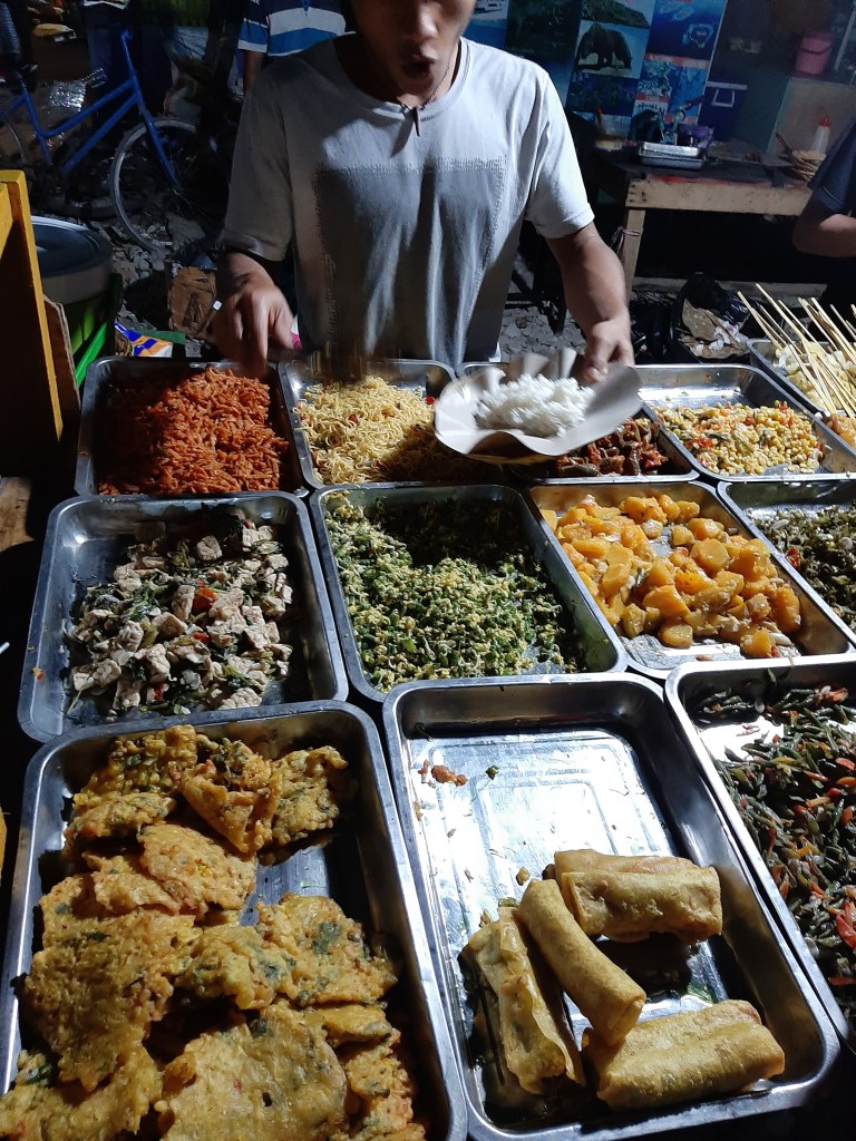 We continue towards the « Night Market ». There are a lot of Street Food stands with fish, chicken, vegetables, fruit … Around 9:00 p.m., you end up choosing a big fish for 2. We pay 150,000 Rp (10 €) for grilled fish, accompanied by rice and sautéed vegetables. We settle down to eat: It’s « roots », we like it. The only downside is the little flying cockroaches that go around the tables. The fish is very good, but we finished very quickly and we ran away because of these insects which start to get excited. One customer had even turned everything upside down while trying to chase a cockroach.