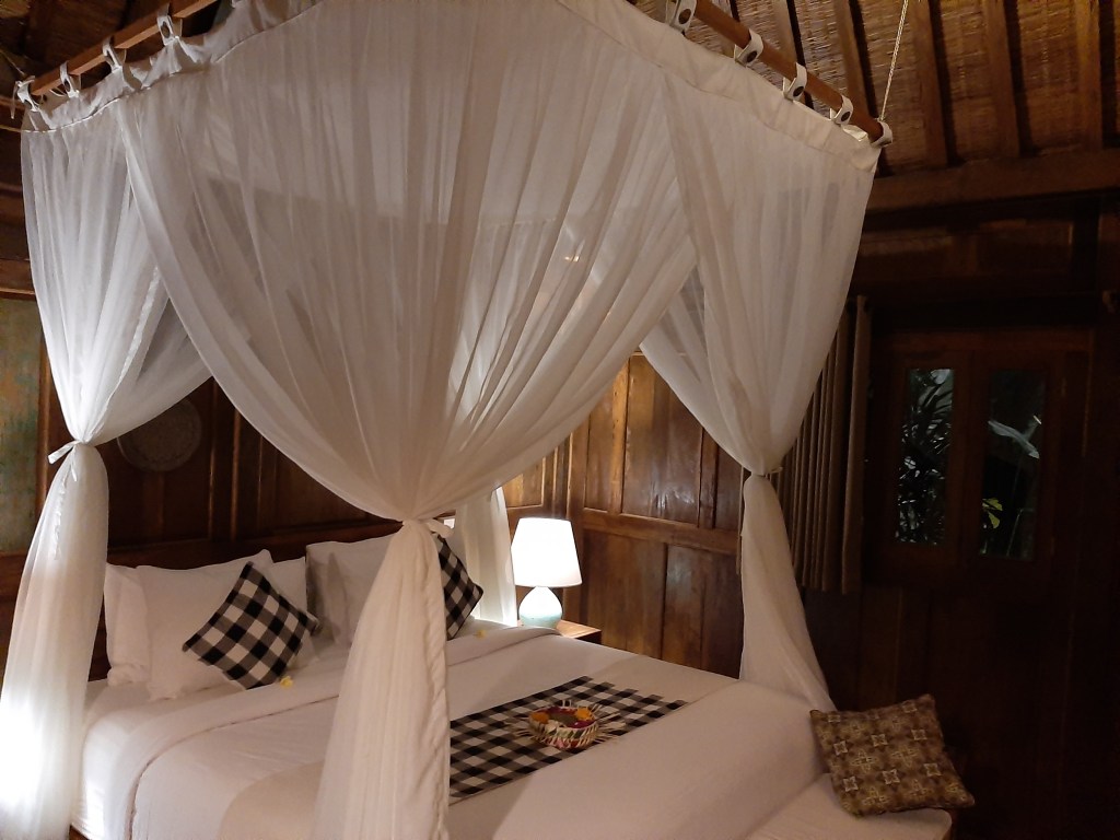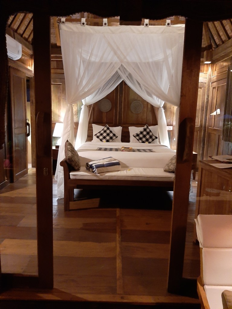 We ask if there is a Warung nearby, and he tells us that we can order dinner with room service too. It suits us perfectly, since we want to enjoy the swimming pool and the magnificent accommodation. We order rice, noodles, pancakes, fresh juice, 2 Bintang for 250,000 Rp (€ 16.7) for 9:00 p.m.