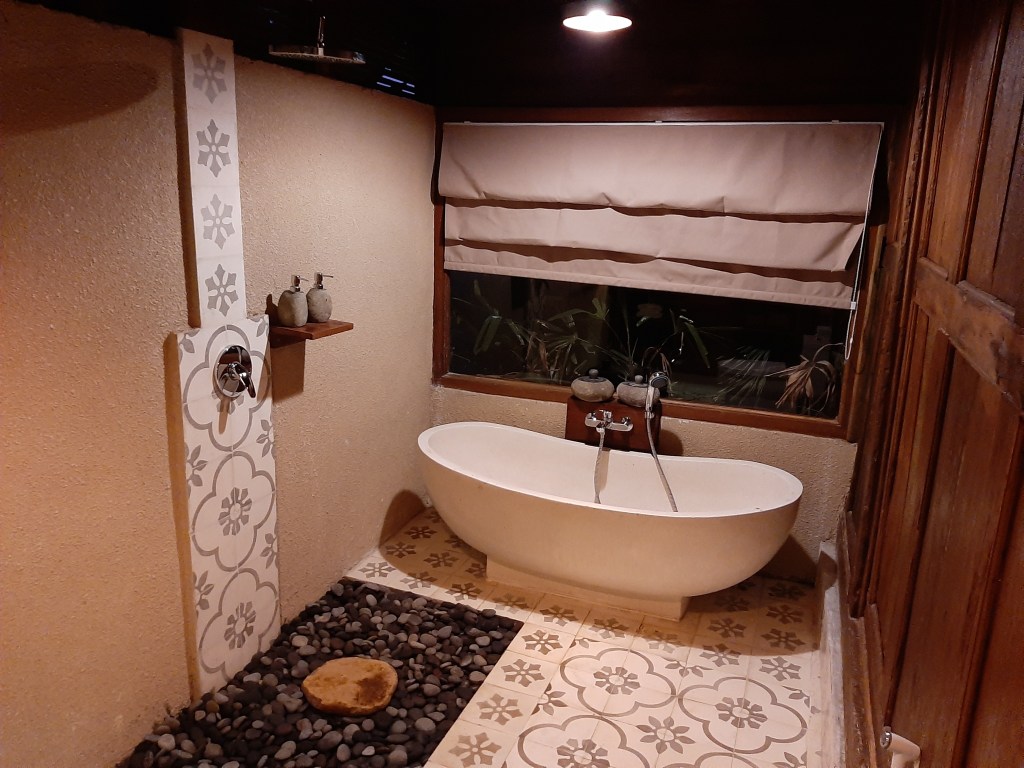 The road is quite simple, we arrive after 20 minutes at our new hotel. The entrance doesn’t look very good. But, once inside, we discover a very nice accommodation: 3 bungalows around a beautiful swimming pool. The room is luxurious. We are welcomed with a very refreshing welcome cocktail. Definitely, our best accommodation in Bali ❤