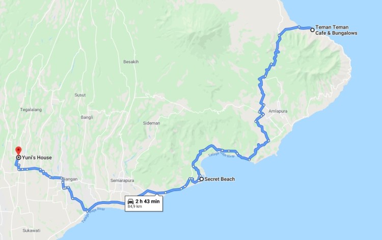 We arrive at Amed, drivers offer to drive us for 200,000 Rp (13.3 €) / person on a minibus, but we already have our driver (The same than brought us from Ubud). We contact him and we make an appointment next to Teman Teman Cafe & Bungalows 1 (our accommodation in Amed). Our driver arrives, and we leave for Ubud to collect our scooter. On the way, we negotiate a stop at « Secret Beach ».