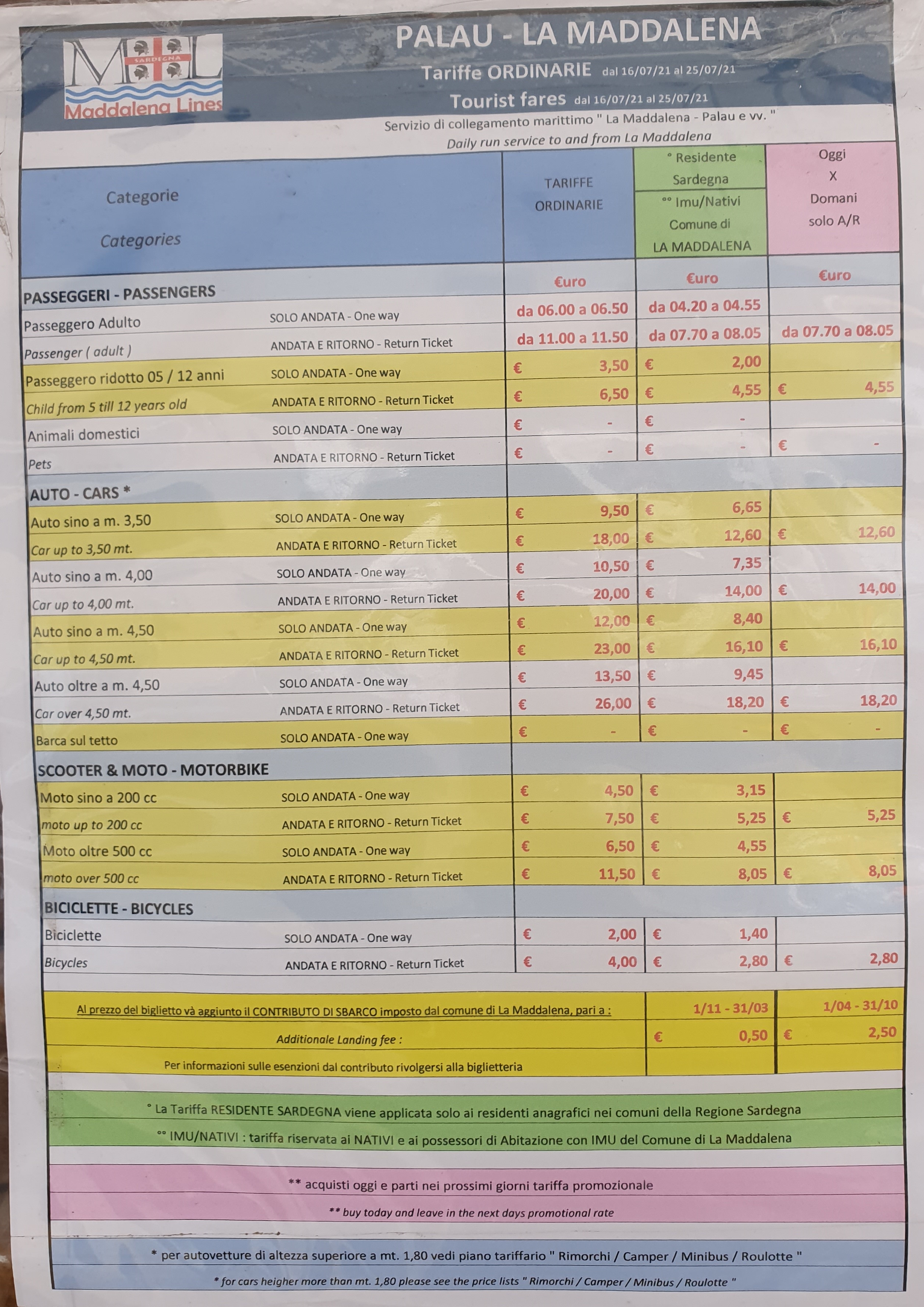 There are 2 companies that offer ferry journeys to « La Maddalena ». « Delcomar » and « Maddalena Lines ». The 2 companies have counters in the port and offer the same services. The crossings last 20 minutes and are carried out every hour or half hour depending on the season. It is always cheaper to buy return tickets . The return date is flexible. We choose the company « Maddalena Lines »