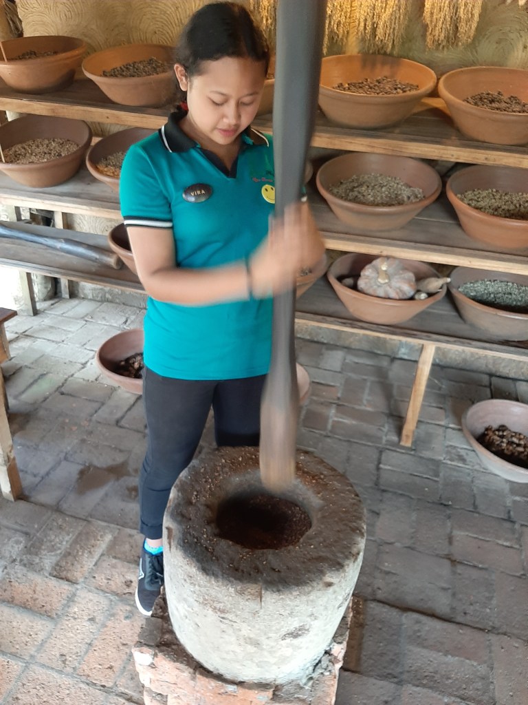 Our first stop, 4km north of our accomodation is: Alas Harum Bali (Jalan Raya Tegallalang). It is an agritourism center where you can discover the making of coffee, taste the Balinese coffee, Luwak coffee and many kinds of teas. Entry is free. We are given bracelets, which we will have to show if we order something to pay. Payment will be made before the exit.