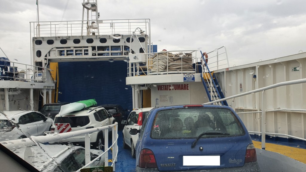 The weather is rainy, we stay in the car on the ferry.