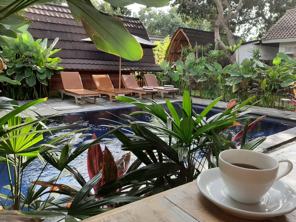 We have breakfast (always included in the price of accommodation) at Kubu Kak Dudung Villas by the small swimming pool. The breakfast is OK (coffee, tea, pancake, eggs, fruit).