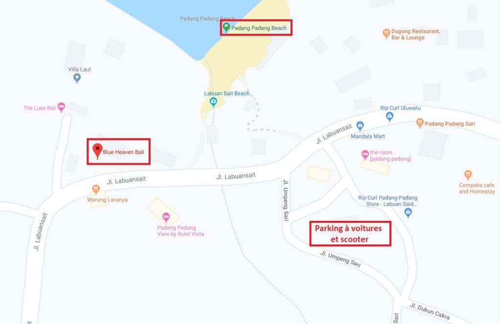 To forget the disappointment of our accomodation, we decide to look for a hotel with an infinity pool to spend the last afternoon in Bali. We find « Blue Heaven » (Jl. Labuansait) a few meters from « Padang Padang Beach ».