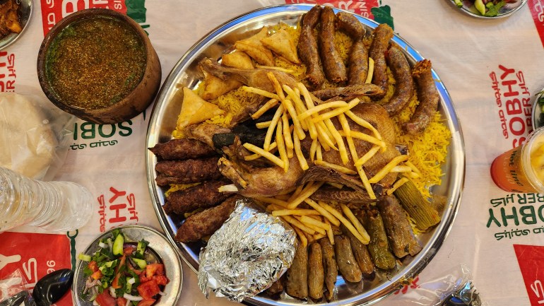 Depending on your taste, you can have one of the mixed dishes which includes a nice and good selection of Egyptian specialties. We also try the Mouloukhiyya (It is a thick soup made from a plant of the same name in Arabic: corète potagère in French). The quantities are extremely generous.