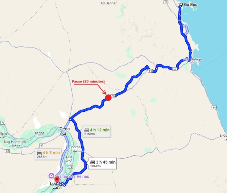 During the journey, the bus stops for a 20-minute break halfway between Hurghada and Luxor. The break is in a café lost in the desert. The owner takes advantage of his exclusive location to have high prices compared to local life (3 € drinks, paid WC, etc.)