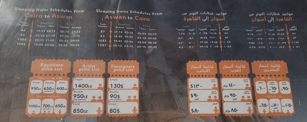 We also buy tickets for the sleeping train from Aswan to Giza (departure scheduled in 7 days). Still with the Arab rate, a cabin for 2 people on the night train costs us 1400 EGP (27 €) per person.