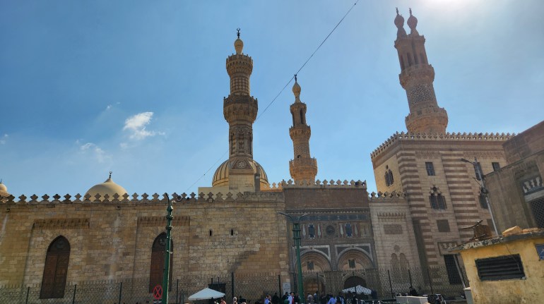 Nous passons devant la mosquée Al-Azhar. C’est Vendredi, jour de prière et c’est presque l’heure de la prière du vendredi. L’endroit est bondé entre les fidèles, les commerçants, les touristes et les policiers qui assurent la sécurité dans un Caire bouillonnante de vie.