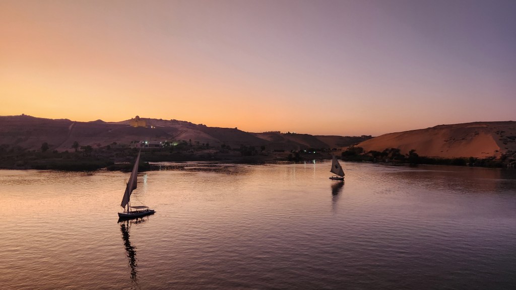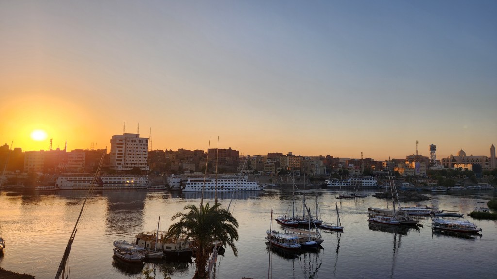Nous nous réveillons avec une magnifique vue du lever du soleil au fond du Nil et la ville d’Aswan
