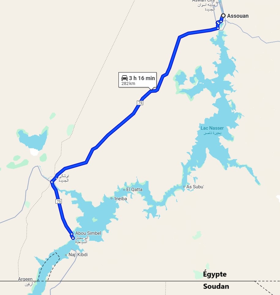 Vers 1960, la construction du haut barrage d’Aswan sur le Nil ordonné par Gamal Abdel Nasser, a donné naissance au lac Nasser bien visible à Abu Simbel