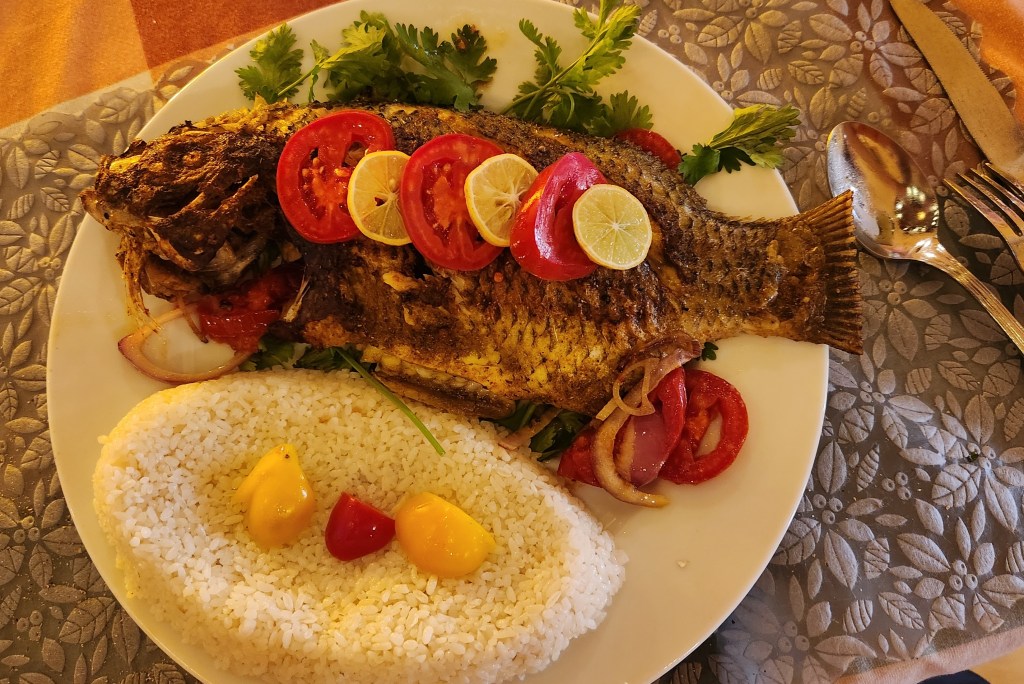 Avant de partir découvrir les temples, nous déjeunons à l’hôtel qui a son propre restaurant. Nous choisissons un plat de poisson provenant du lac Nasser