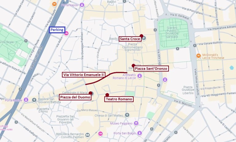After a short nap at our accommodation in Copertino, we head to Lecce to spend the evening. As expected, finding a parking space is a very complicated task.