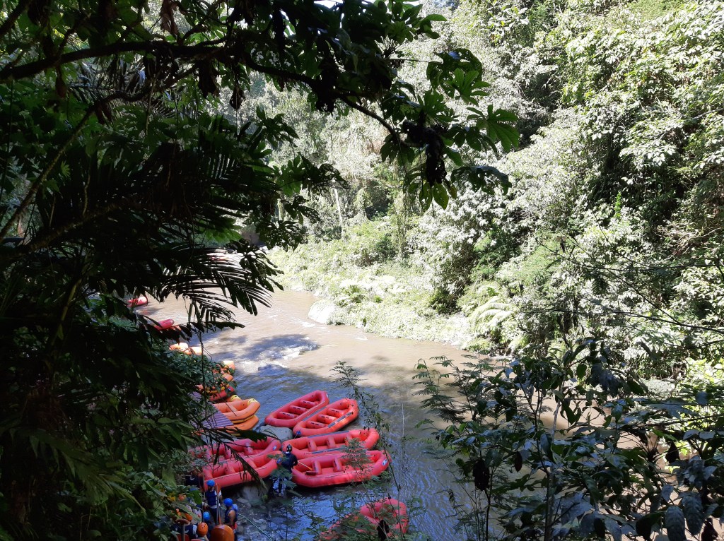 On enchaîne les rapides et les parties calmes de la rivière Ayung sans incident cette fois. La vue est à couper le souffle. Un mélange d’adrénaline et d’émerveillement. C’est une expérience qu’on recommande vivement. Nous avons choisi la rivière Ayung qui est moins difficile que Telaga Waja. On n’a pas été déçu.