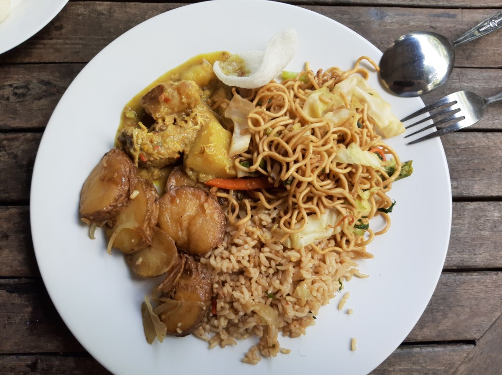On est satisfait de la qualité du buffet : riz (Nasi), nouilles (Mie), poulets (Ayam), salades, pain, pommes de terre… Pour les boissons, il faudra payer à part ( Pour une Bintang : 30.000Rp / 2€ ).