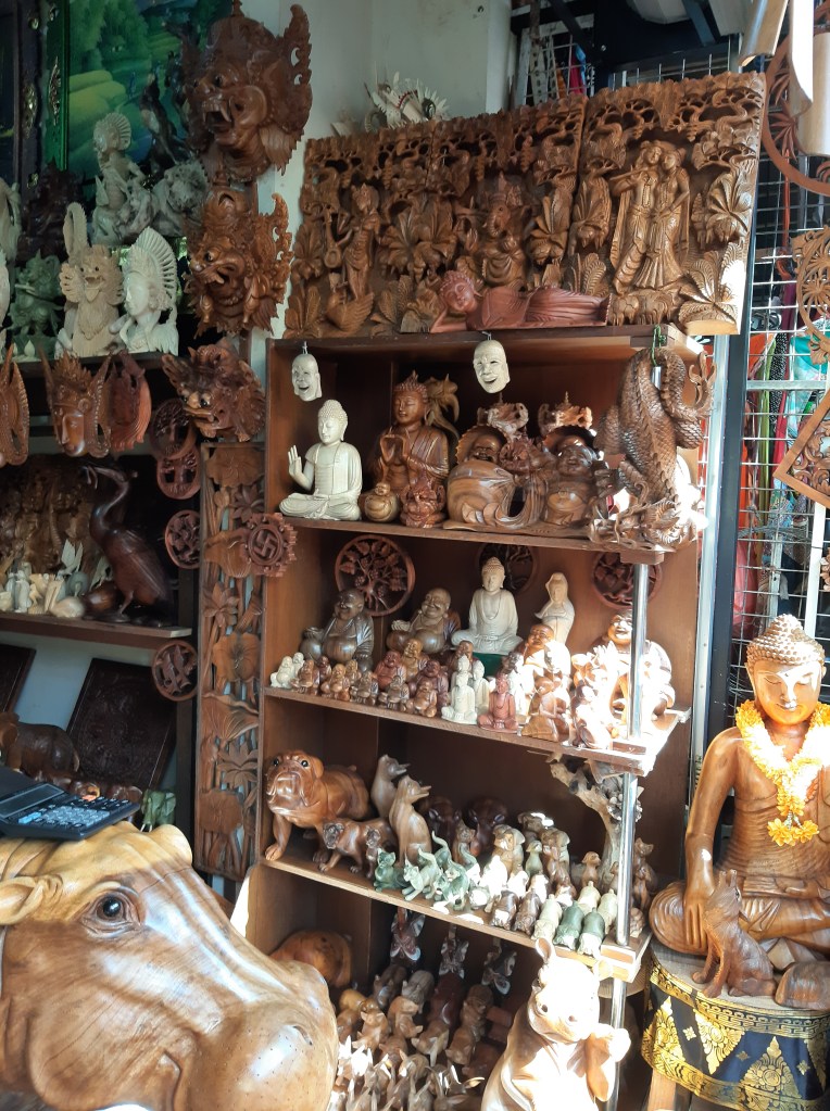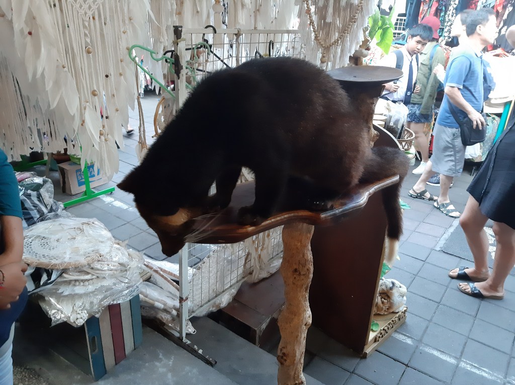 Il est presque 18h00 et le parc va bientôt fermer. On revient vers l’hôtel en repassant par le Street Market. On y trouve une boutique à café (Balistar coffee), certes touristique, mais le café y est très bon, le décor aussi. Entre 20.000 et 50.000Rp pour un café (1,3€ – 3,3€). Il y a même un Luwak (Civette) vivant dans la boutique.