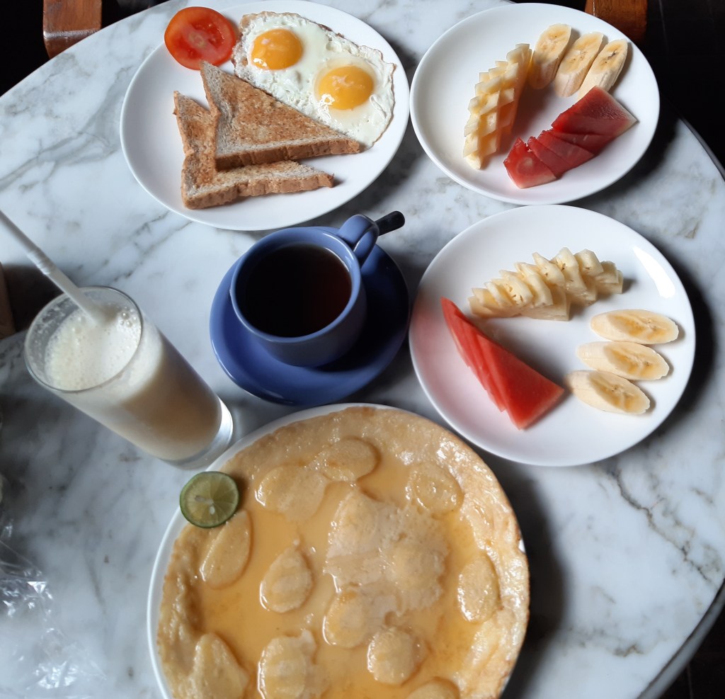Nous prenons le petit déjeuner à notre hôtel au bord d’une petite piscine (inclus dans le prix de la chambre).