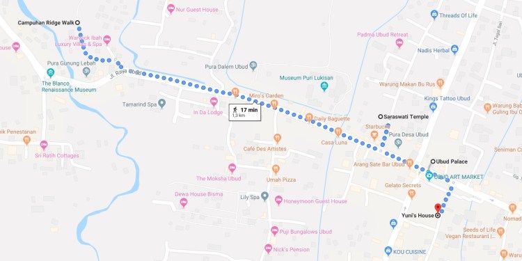 On remonte la rue principale : « Jl.Raya Ubud » jusqu’à notre Guest House en passant par le « Saraswati Temple » et « Ubud Palace ».