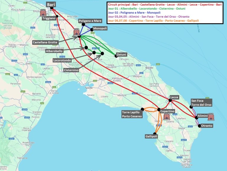 Nous avons fait tous nos déplacements avec une voiture de location récupéré et restitué à l’aéroport de Bari