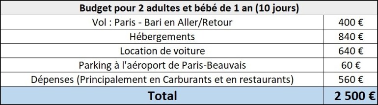 Notre Budget pour 2 adultes et un bébé de moins de 1 an a été de 2500 € pour 10 jours