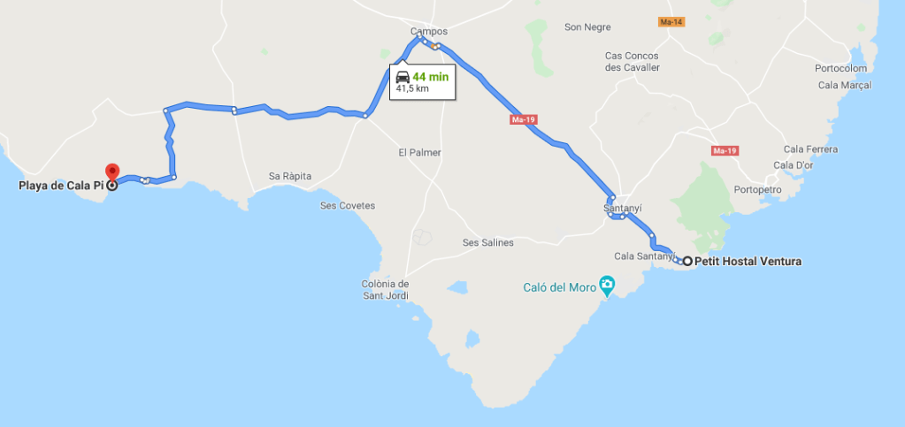 Day 2, we left our hotel « Petit Hostal Ventura » in « Cala Figuera » to the cove of « Cala Pi ». 40 km and 40 minutes separate the 2 points. There is a free parking at 500m from « Cala Pi ». (39°21’54.8″N 2°50’24.6″E)