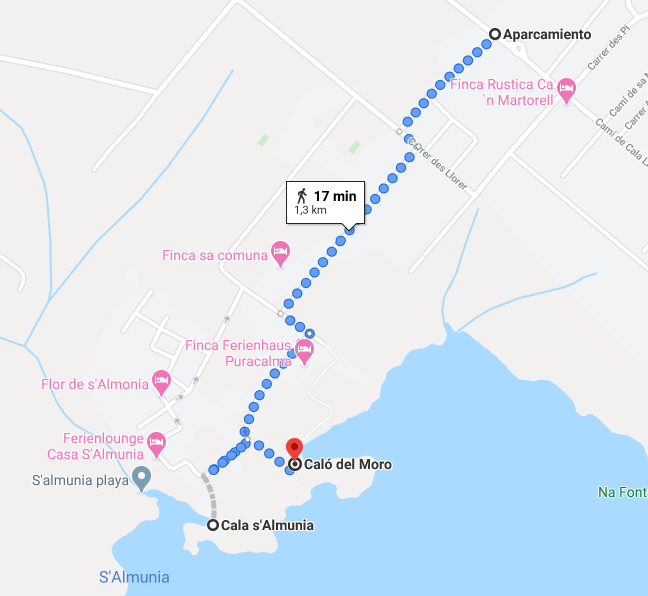 There is free public parking for the 2 beaches (39 ° 19’14.6 « N 3 ° 07’32.5 » E), but you will need to walk for about fifteen minutes to reach one of the 2 coves . The first part of the path (1 km) is a paved road and therefore easier. After that you will see the access to « Cala des Moro » on the left and the one to « Cala s’Almunia » on the right
