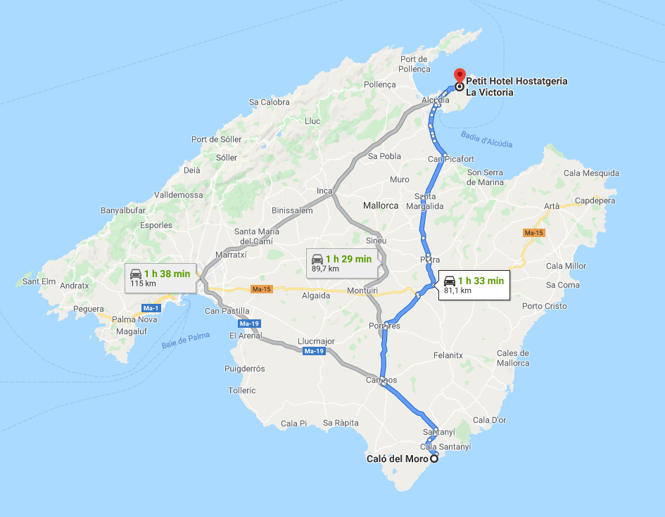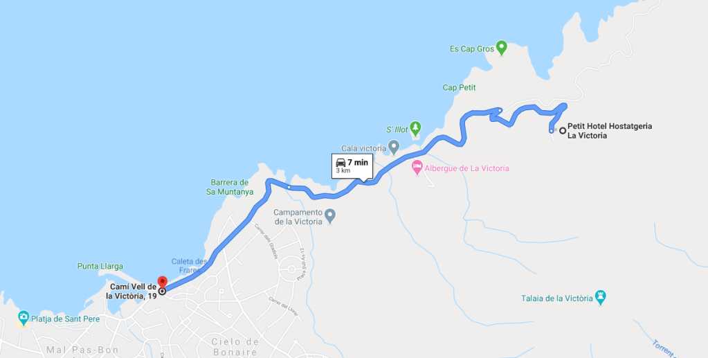 We arrived at our accommodation, it is an old monastery converted into a charming hotel with a breathtaking sea and mountain view. A big and free parking is available. 100m from the hotel, a restaurant with an wonderful view as its name suggests « Restaurante Mirador de la Victoria » (39 ° 52’27.7 « N 3 ° 10’17.5 » E). To eat there, you will have to book in advance and that was not our case.