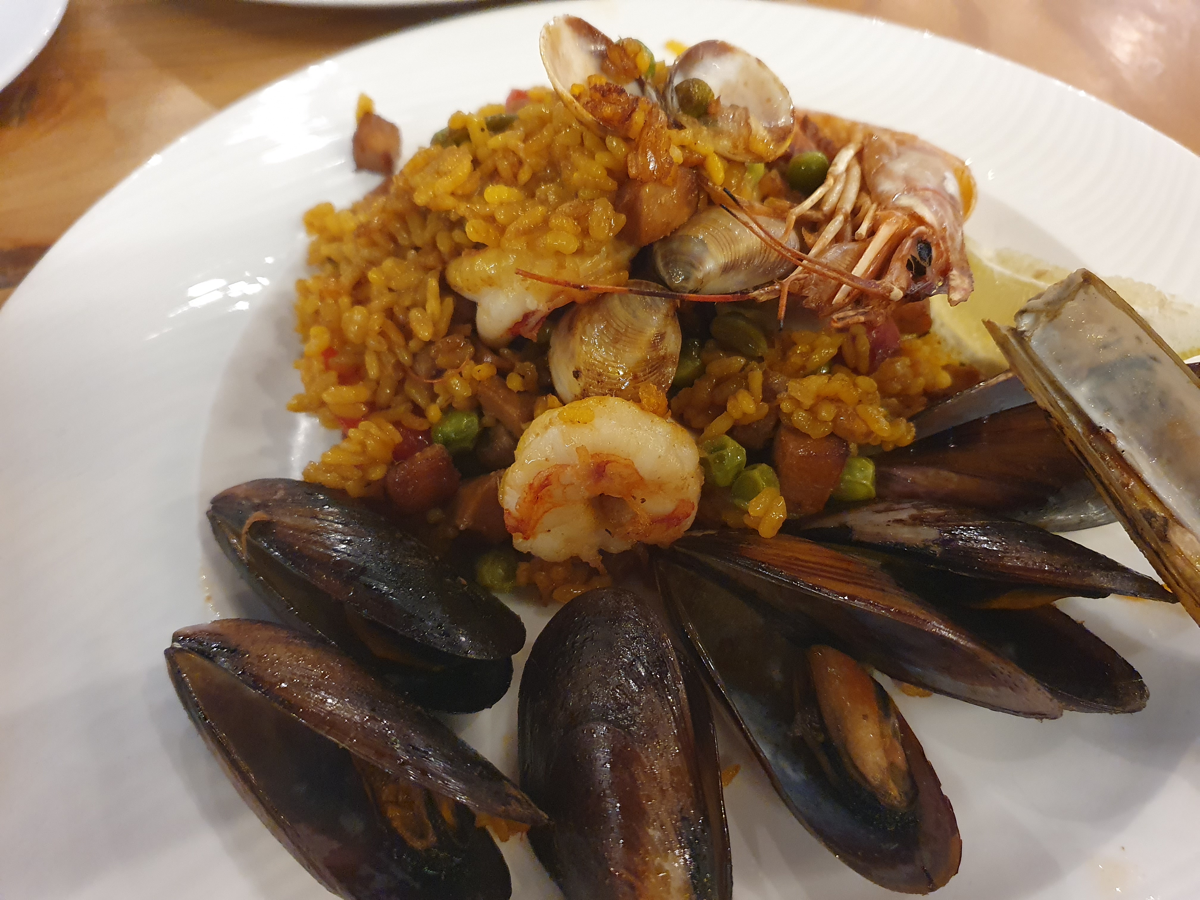 We were very hungry : A dish of tapas for 2 (fried seafood), a Paella, 2 cocktails and a coffee for 60 €.