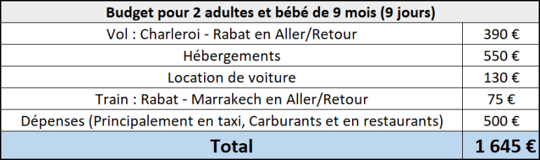 Notre Budget pour 2 adultes et un bébé de moins de 9 mois a été de 1 645 € pour 9 jours :