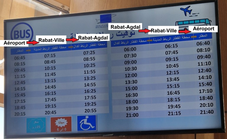 Pour quitter l’aéroport, nous choisissons de prendre le bus vers la ville de Rabat. Le bus vous dépose à la gare du centre-ville au bout de 15 minutes. Il faut compter 10 minutes de plus pour la gare de Rabat Agdal. Le trajet coûte 25 MAD (2,5 €) par personne.