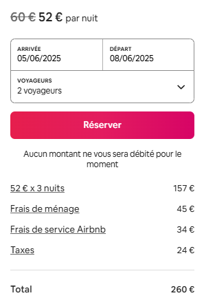 En faisant votre choix, n’oubliez pas de vérifier le prix final, ce qui inclut généralement les frais de ménages, les frais de airbnb et les taxes :
