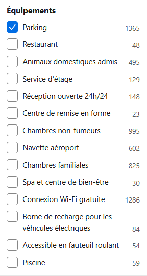 airbnb propose aussi plusieurs filtres (équipements, prix…) :