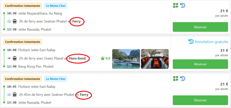 Avant de réserver, vérifier le type d’embarcation afin de prendre celle qui vous convient. Le trajet avec un Ferry sera plus long que celui avec un Hors-bord. Un trajet en Hors-bord est moins confortable avec un risque élevé de mal de mer. À vous de choisir :