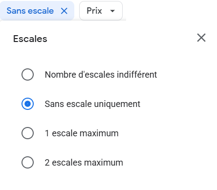 Vous pouvez ensuite appliquer plusieurs filtres. Par exemple, vous pouvez choisir de chercher uniquement les vols sans escales :