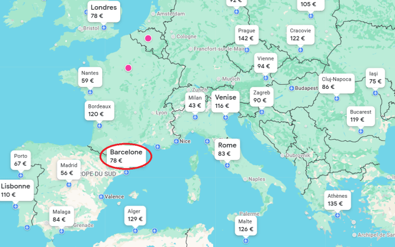 Choisissons par exemple « Barcelone » pour un prix de 78 €. Cliquez sur « Voir les Vols »