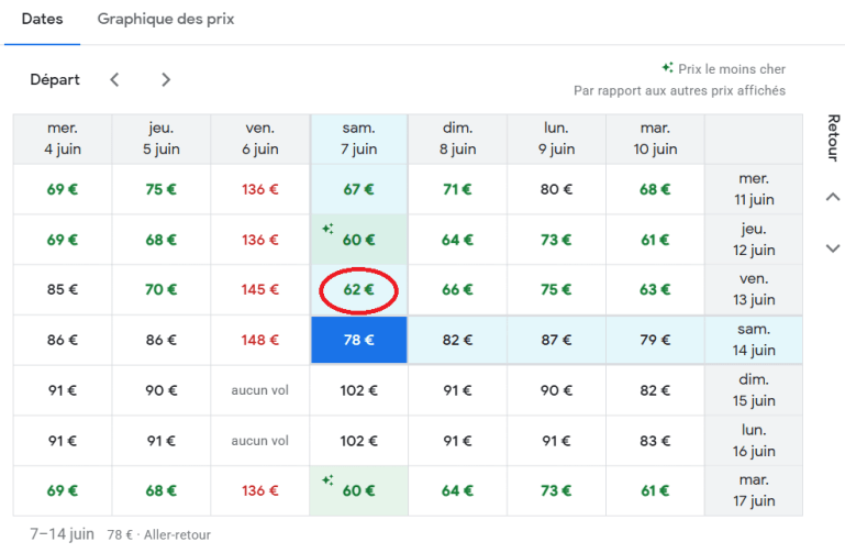 Comme par exemple ici, en choisissant une date de retour différente, le prix du vol Aller/Retour passe de 78 € à 62 €. Vous pouvez faire de bonnes affaires avec ces outils